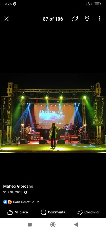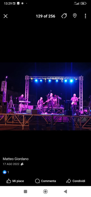 Una americana con torri 30x30 più impianto audio maggiorato rispetto al primo allestimento, più due tralicci fronte palco, con fari par, più teste mobili .
